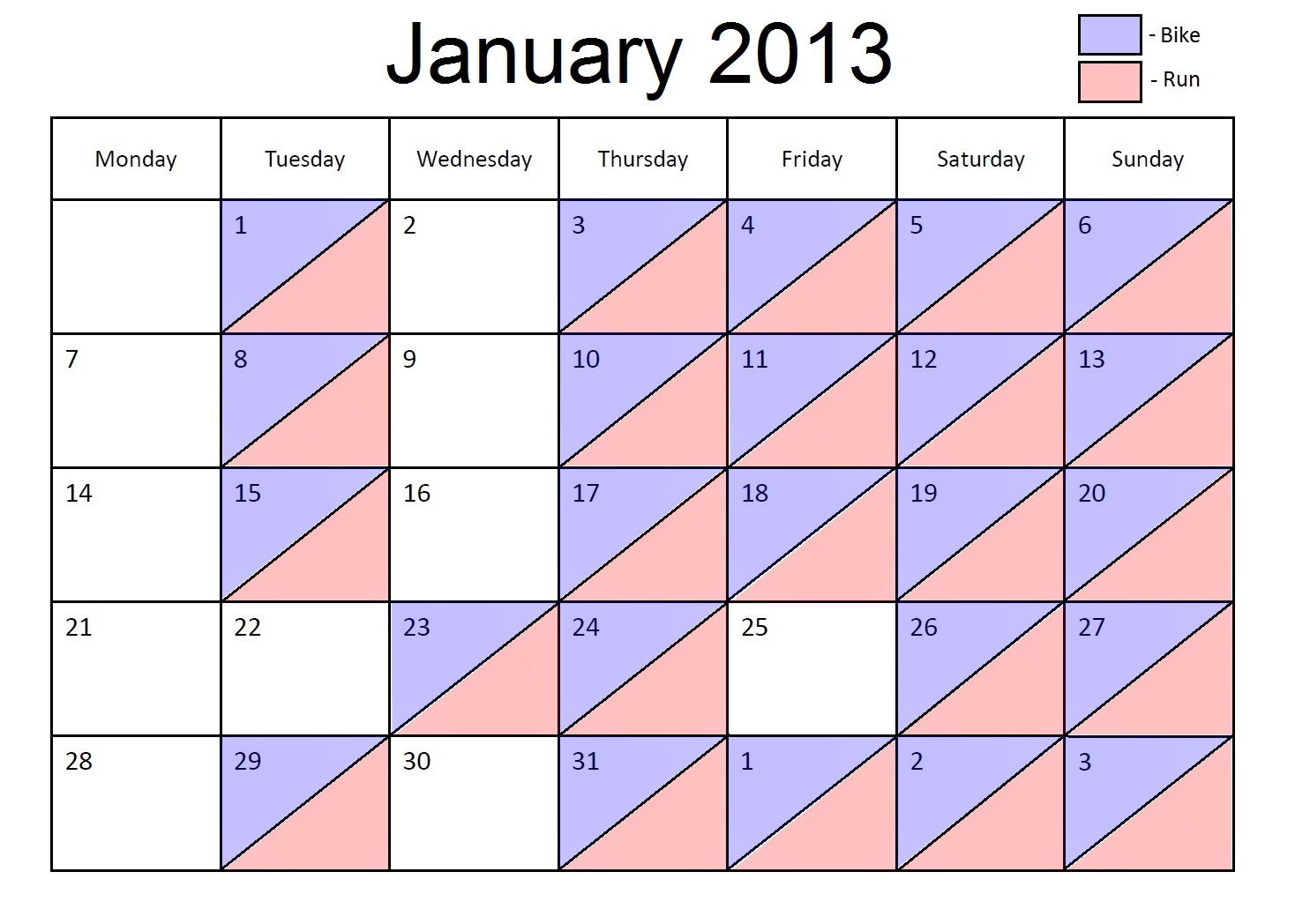 In 2012 I rode 3 days a week and did one brick a week, if that. In 2013 that number was bumped up to 5 on average (some fewer, just completed my first 7 day brick last week). In addition, every one of my long rides was preceded by a run. Here’s a small snapshot of what I’m talking about with the month of January –
