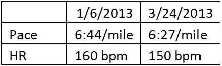 At the tail end of my 3/24 run I was holding 6:05 pace at the same HR as my 1/6 run when I was only holding 6:44’s!