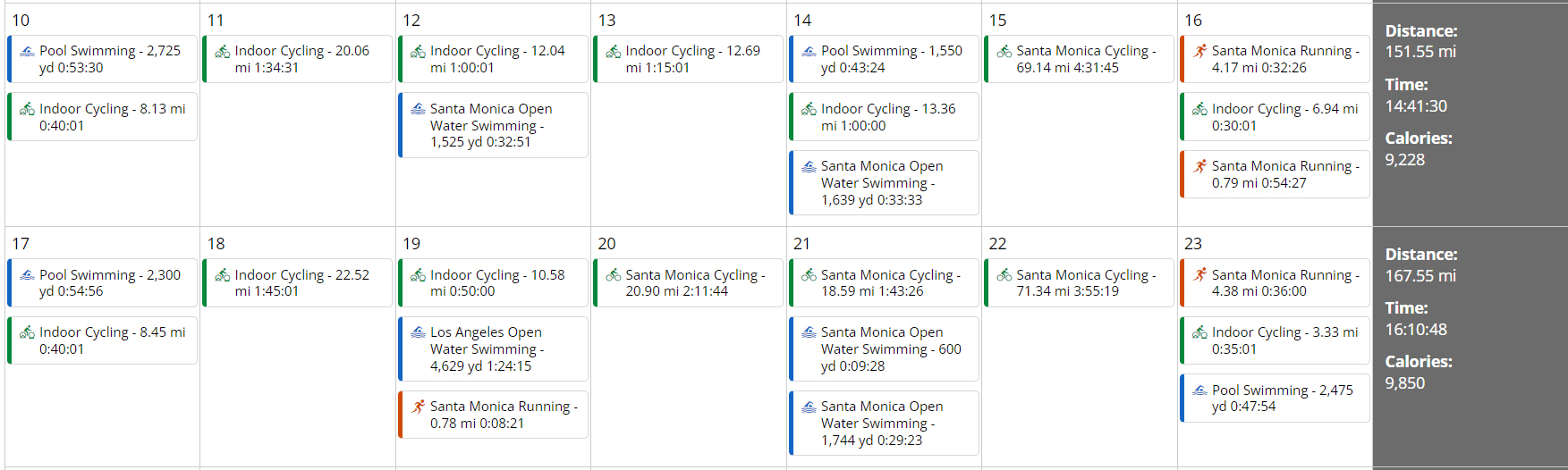 The culmination of all these events, my poor fitness and seemingly not having enough time to properly build was very emotionally crushing, but it served a purpose. It reanimated my desire and reset my focus to make the best of the remaining 3 months. In that time I was able to complete 120 workouts, mostly following the template I had learned with QT2 but adjusted without running to 6 rides a week and 4 swims (2 ocean, 2 pool). Cycling – Monday jumps, Tuesday Intervals, Wednesday steady, Thursday muscular endurance, Friday recovery, Saturday long and optional Sunday coffee ride. Swimming – Monday/Sunday Intervals, Wednesday Tower 26 workouts and Friday LATC beach workouts.